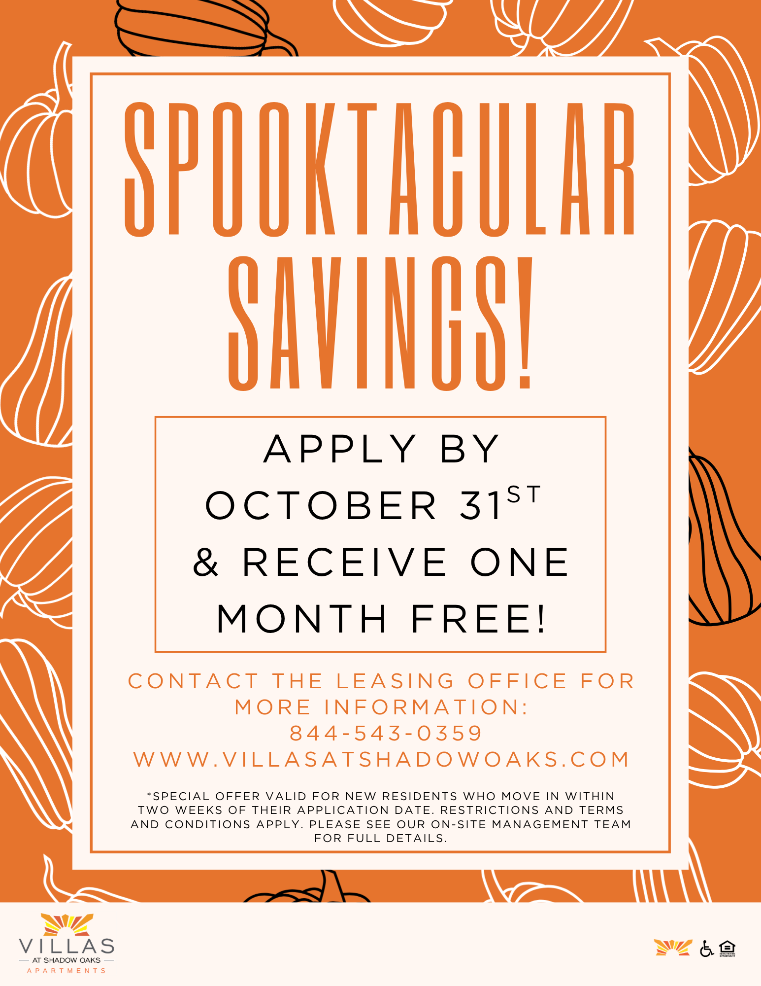 Apply by October 31st and receive one month free! Contact the Leasing Office for more information!⤵️ ¡Solicita antes del 31 de octubre y recibe un mes gratis! ¡Contacta con la Oficina de Arrendamiento para más información!⤵️